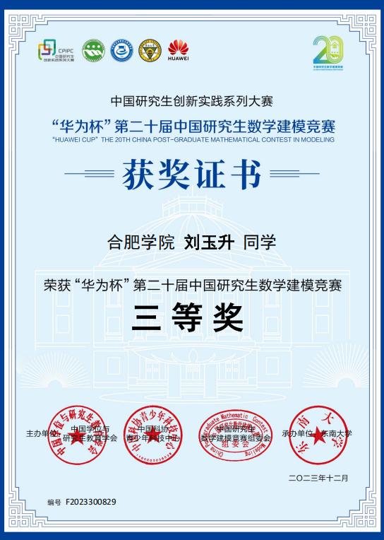 刘玉升始终秉持“以赛促学、以赛促研”的理念,积极参与各类高水平学科竞赛,在实践中不断拓展学术视野、提升创新能力。在2023华为杯第二十届中国研究生数学建模竞赛中,他带领团队克服重重困难,最终荣获国家三等奖。