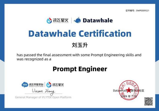 20246月至9月,在导师推荐下,刘玉升通过选拔进入科大讯飞股份有限公司讯飞数码研究院实习,深度参与了讯飞星火大模型的研发工作,主要负责Prompt工程优化任务。凭借扎实的专业基础和出色的工程能力,他系统性地完成了各类任务的整编工作,通过深入分析客户需求,制定了差异化的Prompt优化策略。在数据处理层面,他运用Python对训练数据进行清洗与统计分析,成功构建了包含10万余条的高质量SFT数据,覆盖33个具体任务场景。此外,他还参与了大模型效果的评测工作,为后续模型的迭代优化提供了支持。
