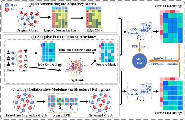 针对上述问题,刘玉升所在团队提出了一种基于邻接矩阵重构与属性自适应扰动的图增强方法,能够在保持原始语义信息的同时,自适应地去除图中的噪声干扰,从而提升推荐系统的性能与泛化能力。项目组通过长达16个月的持续攻关(包括10个月的反复实验验证与6个月的论文撰写与修改),研究成果《Graph Augmentation Empowered Contrastive Learning for Recommendation》发表于CCF-A类国际权威期刊《ACM Transactions on Information Systems》。