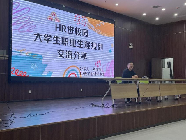 10 月 11 日下午两点,设计学院迎来2004级工业设计专业优秀校友胡彪贤(现任安徽天地间博展科技有限公司总经理)、2010级工业设计专业优秀校友刘文渊(现任合肥商超电子商务有限公司总经理)两位优秀校友重返校园,为我院学子带来了一场别开生面的职业生涯规划课。本次职业生涯规划讲座由设计学院党委副书记吴云主持。