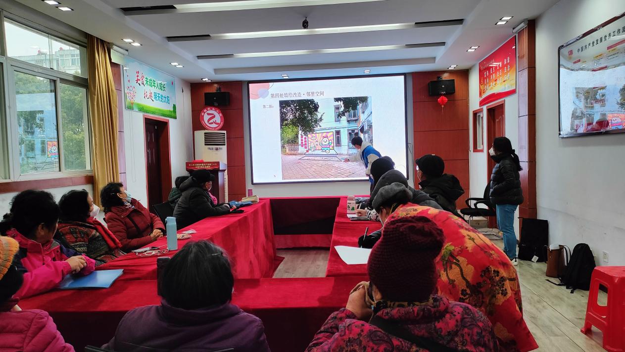 会上教工第二党支部田文老师介绍了项目选址、项目实施方案以及项目设计理念等,辖区居民骨干、党员代表共同参与项目讨论,就方案的细节提出了有价值的意见和建议,竹荫里社区党委书记孟书记对方案的设计内容和创新做法表示充分肯定,此次项目见面会为后期项目实施开展打下了良好基础。
