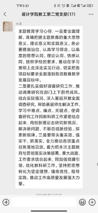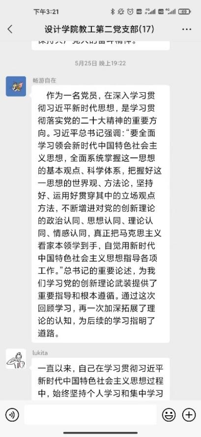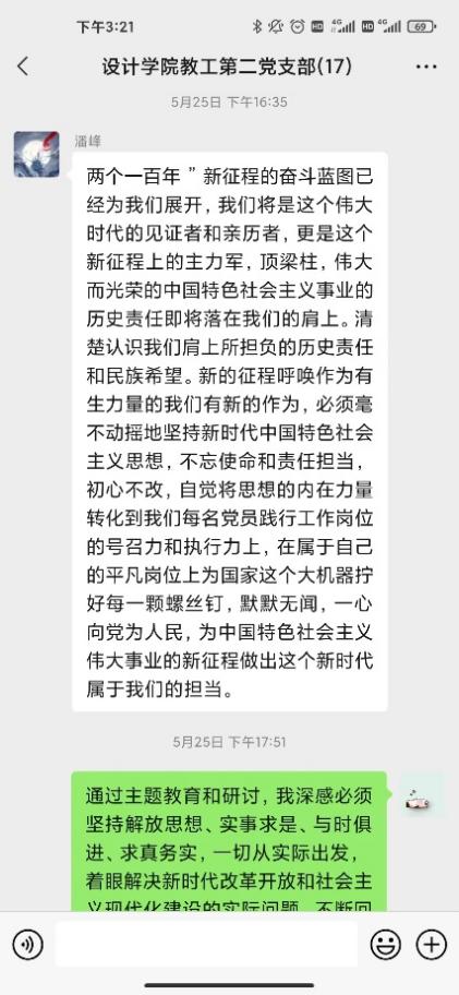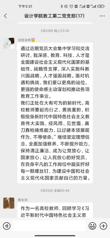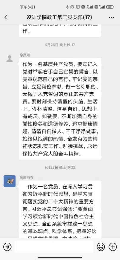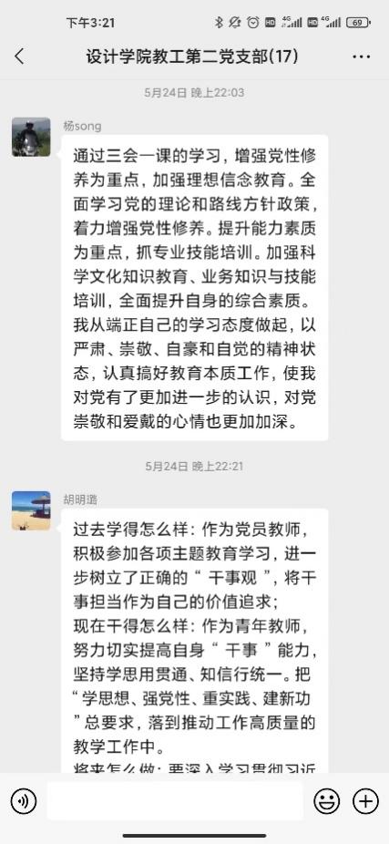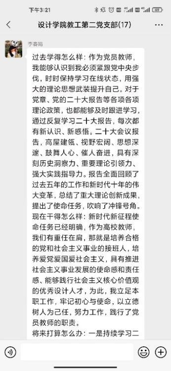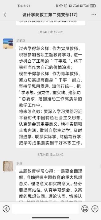 研讨会第二环节支部党员针对合实际围绕“三问”(过去学得怎么样、现在干得怎么样、将来打算怎么办)展开了线上交流研讨。党员教师在支部微信群积极展开研讨,深入剖析过去、现在、未来的工作和学习。