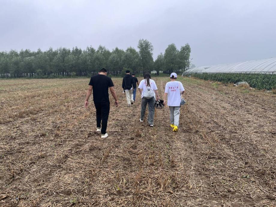 第三小组由头铺镇团委副书记沈瑞带领我们前往头铺镇薛林村进行实地调研。我们了解到头铺镇的主要农产品葡萄的种植情况与市场销售情况,此外,当地还种植有线椒、青椒、白桃等农产品,同时有养牛等养殖业。我们在镇干部的带领下走进葡萄大棚,近距离观察头铺葡萄的种植环境和生长状况。最后,我们参观了其他农产品的种植区域。凌书记和吴老师与当地干部进行交流,详细了解头铺镇农产品的具体设计需求,并提出打造带有镇域整体风格的系列设计方案,包括产品包装、宣传手册、采摘地图、IP形象等。