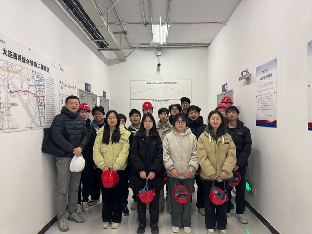 最后在大连西路地下综合管廊项目,在负责人李总的带领下,同学们参观了综合管廊监控中心,详细了解综合管廊的建设历程、整体规划及亮点特色。在管廊内部,同学们还详细了解了水电气系统、环境与监控报警系统、火灾报警系统等城市生命线的设计原理及监测技术应用。