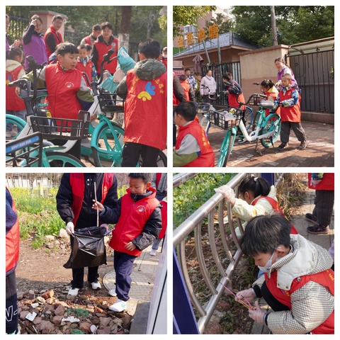 活动当日,志愿者们前往合肥市金湖社区,与合肥市金湖小学一(1)班的小学生们深入社区与植物园周边绿地,重点清理绿化带垃圾,并向当地居民普及垃圾分类知识,引导公众参与环保行动;他们还在道路旁的共享单车停放区开展秩序维护,扶正倒伏车辆80余辆,劝导路人规范停车。活动中,志愿者们带领小学生共同劳动,通过大手牵小手的协作模式,将环保理念传递给下一代,让他们在实践中感悟奉献精神。