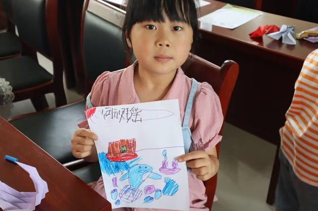 活动开始,志愿者姚媛首先为小朋友们放映了《一条鲸鱼的尾巴》保护环境宣传片。片中讲述了一条鲸鱼帮助被困在废弃塑料中的一群海底小生物的故事。观看影片之后,小朋友纷纷对影片中保护海洋生物,垃圾分类表达了自己看法,并用画笔描绘出自己心目中的理想家园。