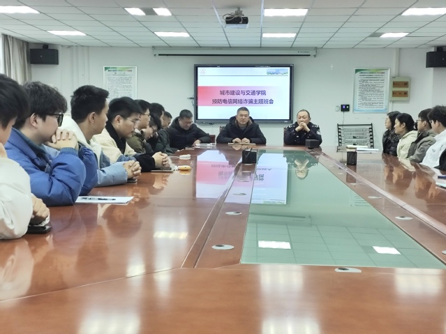 为进一步加强防范电信网络诈骗工作,切实做好校园反诈宣传教育,遏制电信网络诈骗对大学生的侵害。2023年12月15日,城市建设与交通学院在41栋会议室开展预防电信网络诈骗主题班会。本次主题班会特别邀请经开区锦绣派出所警官、校党委学生工作部部长丁增云、保卫处治安科科长王良斌、院党委书记张永军出席,我院学工全体工作人员以及各班班长参加。