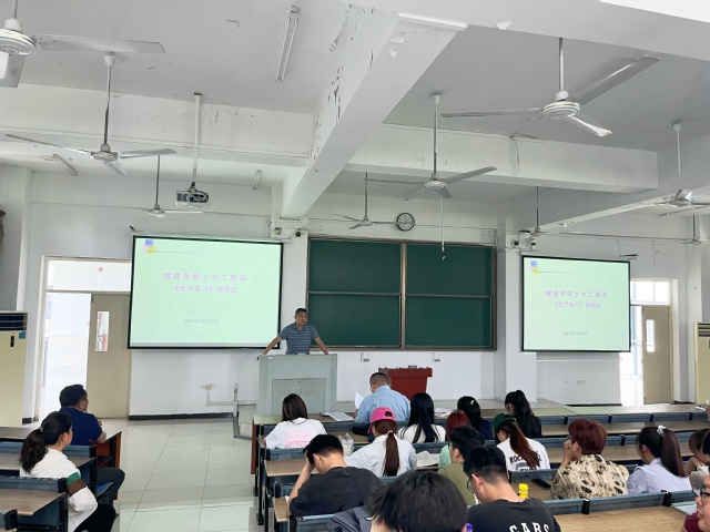 2024年5月24日中午,城市建设与交通学院土木工程系于41栋3JT教室召开21级土木工程专业生产实习动员会。会议由土木工程系主任马翠玲主持,学院党委书记张永军、副院长刘伟、生产实习指导老师及21级土木工程全体学生参加此次动员会。