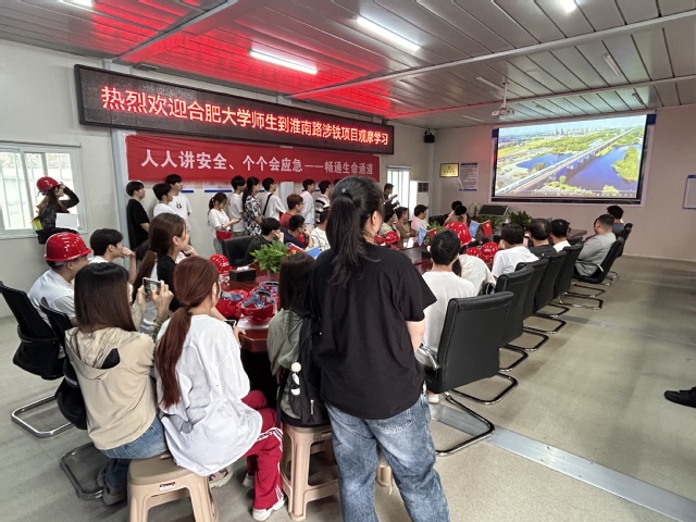 上午9时30分,师生们抵达项目部会议室,首先观看了项目部精心制作的宣传视频。视频详细介绍了淮南路涉铁项目的工程概况、建设进度、技术创新等内容,让同学们对项目有了初步的了解。