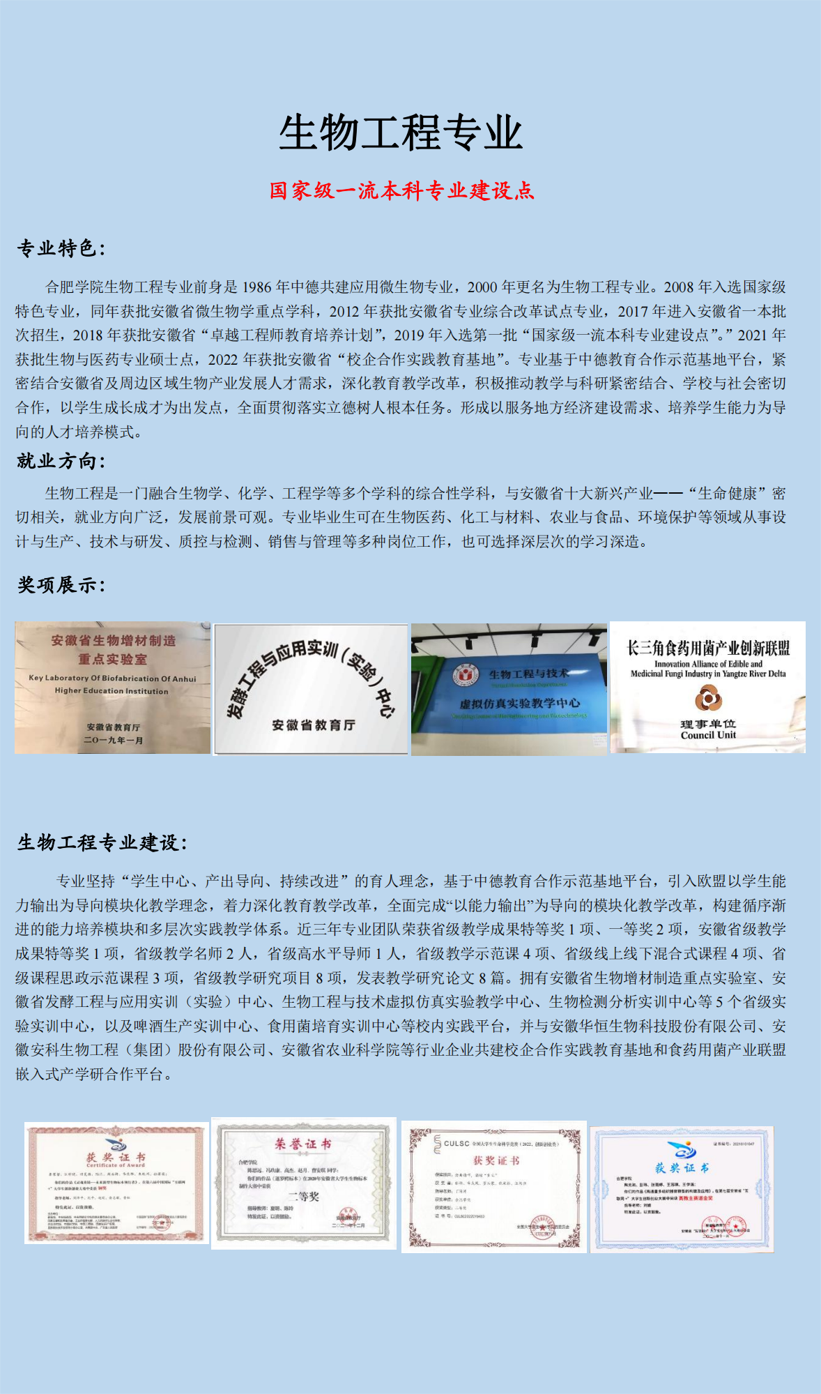 培养目标及特色:本专业培养德智体美劳全面发展,适应安徽省及周边地区经济建设和社会发展需求,具备数学与自然科学、生物学和工程学基本知识,掌握生物产品大规模制造的科学原理,熟悉生物产品加工和设计的基础理论和技能,能够在生物、医药、材料、化工、环境和食品等领域从事生产制造、工艺设计、质量保证、技术研发、生产组织和运营管理等复杂工程实践活动的应用型人才。生物工程专业引入欧盟以学生能力输出为导向(OBE)的模块化教学理念,结合安徽省生物产业人才需求,完成以能力输出为导向的模块化教育教学改革,构建产教融合的人才培养体系,校企协同培养学生工程实践能力。
