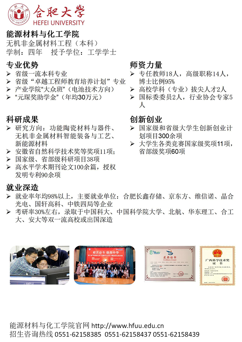 无机非金属材料工程(本科)  咨询电话:0551-62158385