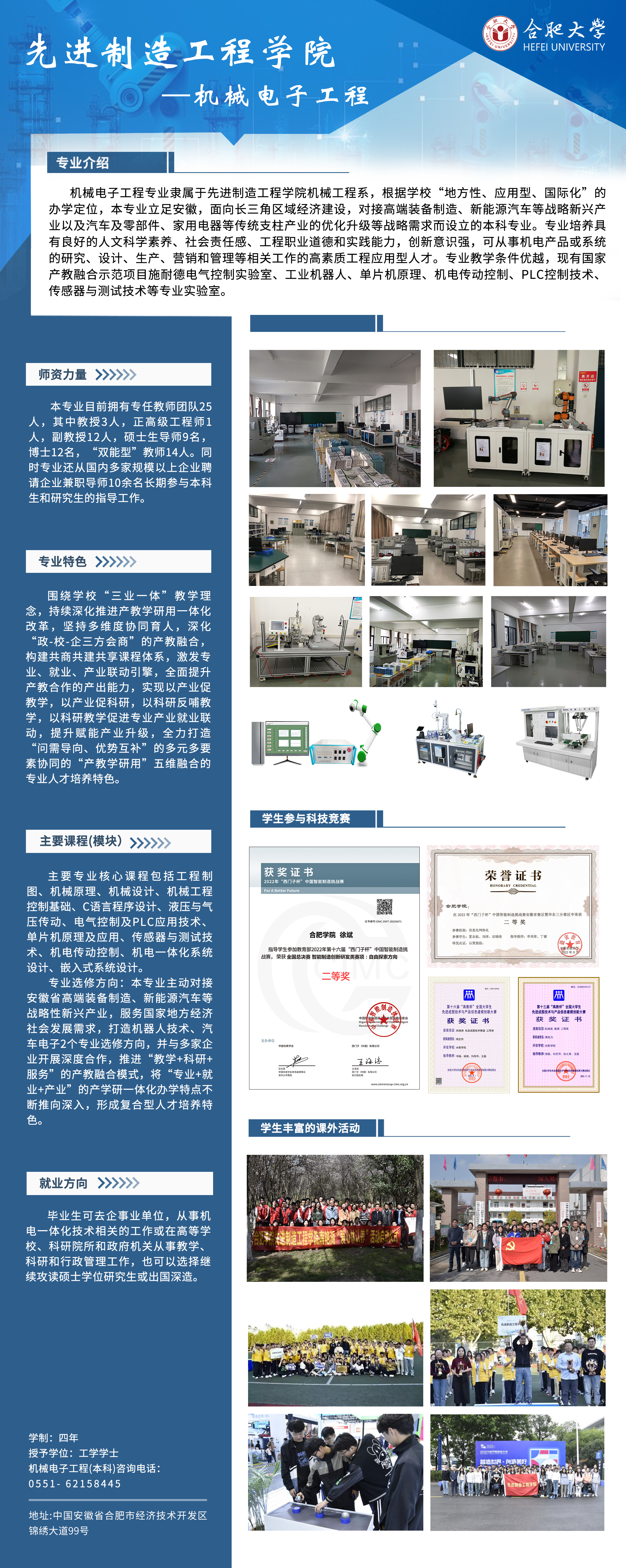 培养目标及特色:本专业立足安徽,面向长三角区域经济建设,培养德、智、体、美、劳全面发展,具有良好的人文科学素养、社会责任感、工程职业道德和实践能力,创新意识强,可从事机电产品或系统的研究、设计、生产、营销和管理等相关工作的高素质复合型工程技术人才。专业具有机械、电子和计算机等多学科交叉的特点,设有机器人技术、工厂自动化和汽车电控等专业方向,在跨文化和多学科背景下,借鉴德国应用科学大学的人才培养模式,构建了机、电、液、光、热相融合的模块化课程体系。