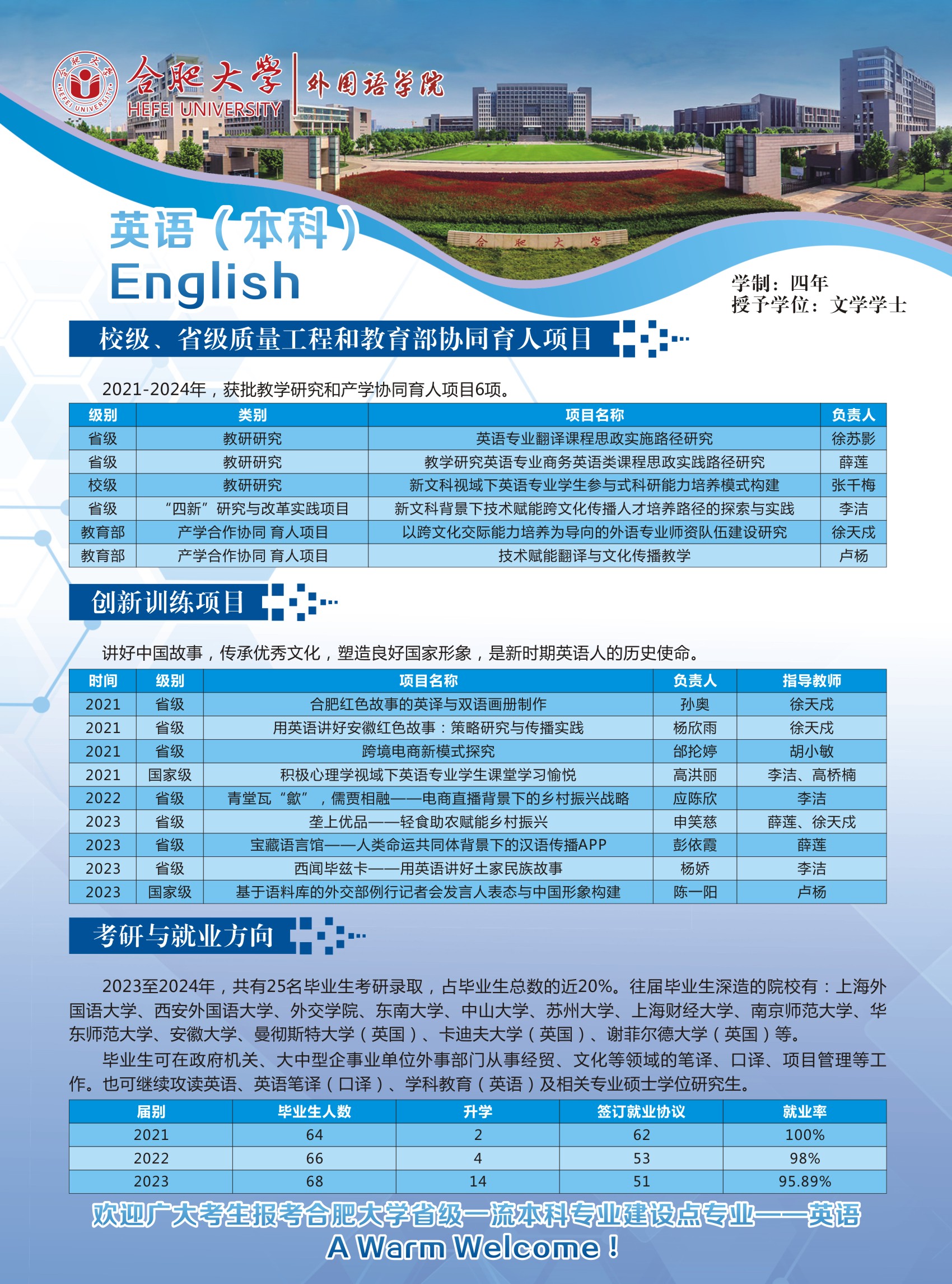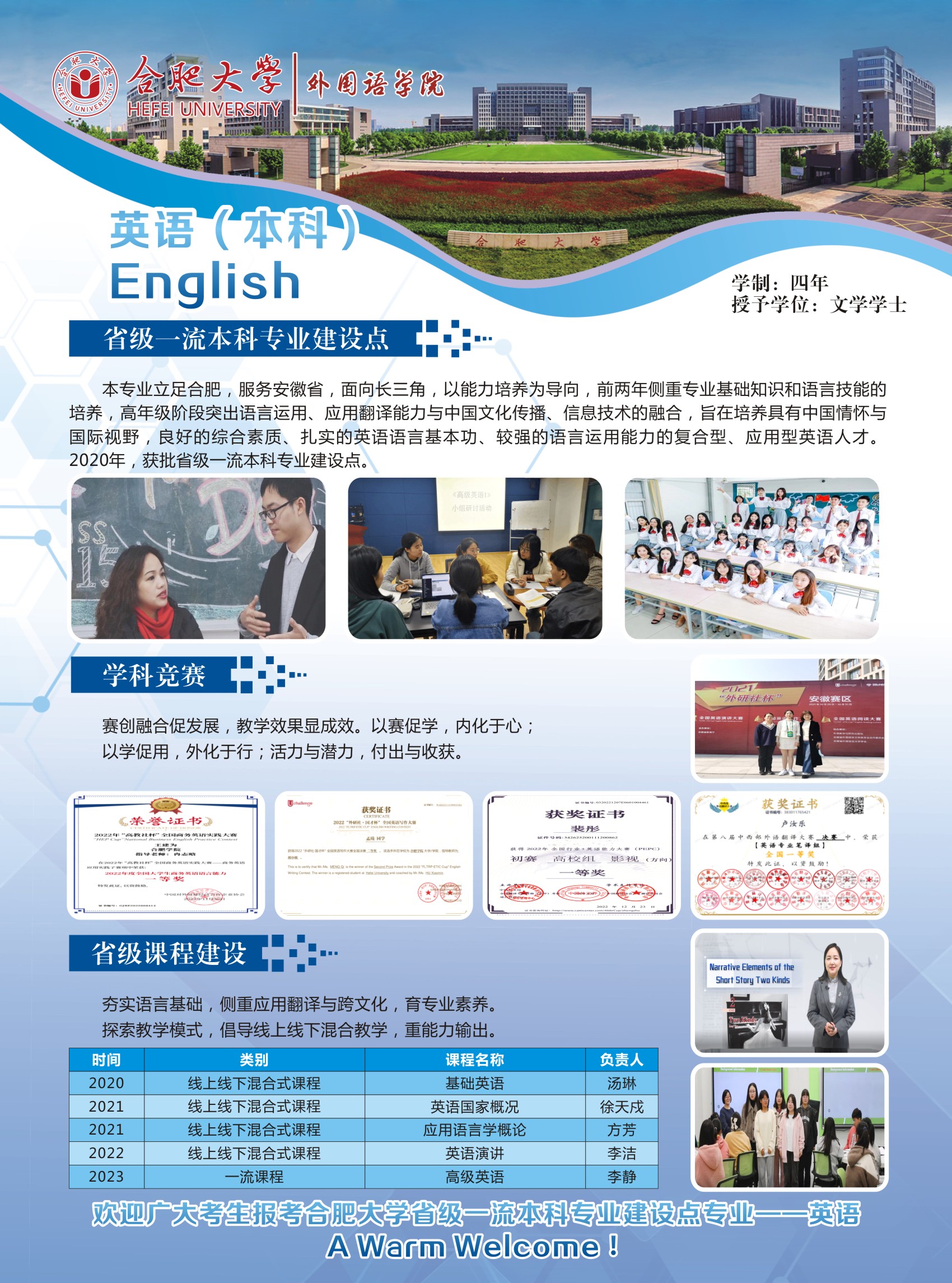 培养目标及特色:本专业培养德、智、体、美、劳全面发展,具有良好的综合素质、扎实的英语语言基本功、较强的语言运用能力和应用翻译能力、厚实的英语专业知识和必要的英语教育或商务英语专业知识与技能,能适应安徽、合肥与环巢湖地区区域经济一体化发展和对外宣传需要,熟练使用英语从事涉外行业、语言服务行业和英语教育教学等项目管理、应用翻译、教学等相关工作的具有较高跨文化传播能力的复合型、应用型英语人才。本专业注重自主学习平台建设打造分层次的集中实践和课内实践教学体系,开拓应用能力培养的课内外输出路径,提升了学生讲述中国故事、安徽和合肥外宣话语的写作、演讲、翻译和阐释能力。