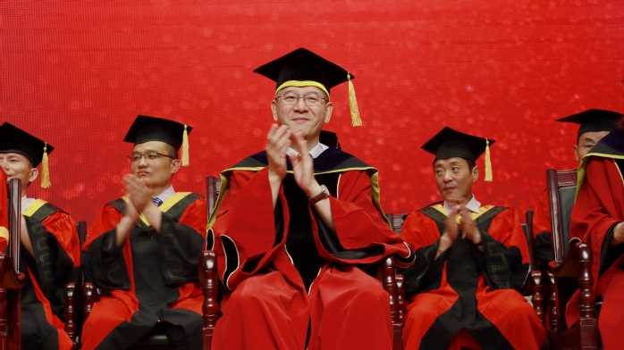 典礼最后,校学位评定委员会全体成员跟现场毕业生代表握手送别。