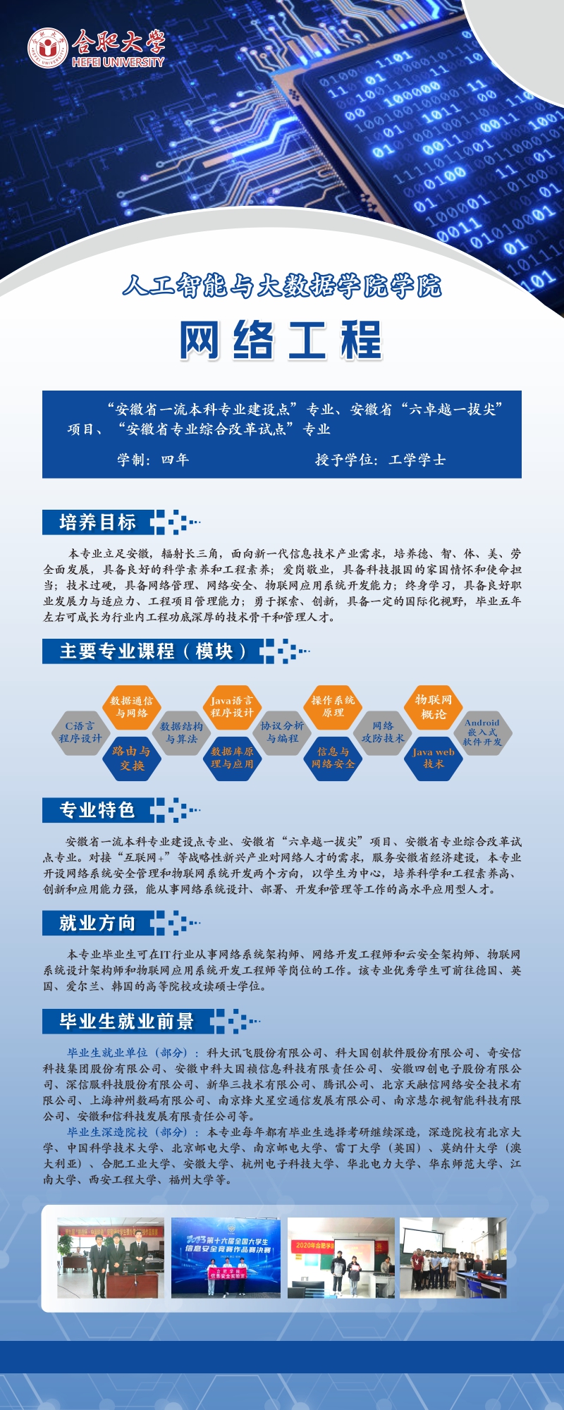 培养目标及特色:本专业立足安徽,辐射长三角,面向新一代信息产业发展需求,培养德、智、体、美、劳全面发展,具备良好的科学素养和工程素养,具有网络基础、网络协议、网络管理和网络安全等方面扎实的理论基础,并通过提出问题、分析问题、自主学习来解决复杂网络工程问题,能够从事计算机网络系统的分析、设计、集成、开发、测试、运行维护和管理的高素质工程应用型人才。