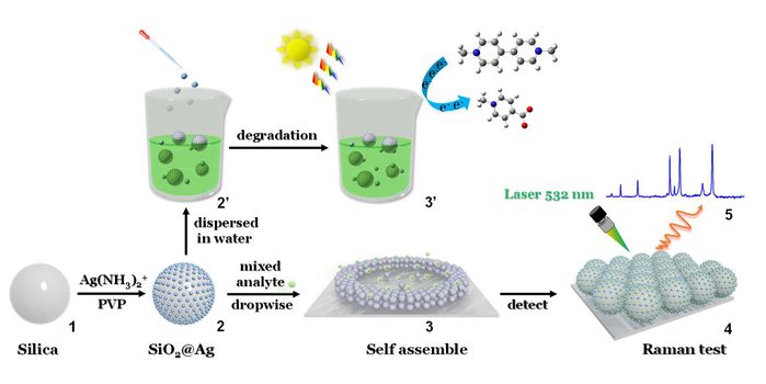 该研究工作以痕量除草剂(百草枯和敌草快)残留为目标牵引,利用咖啡环效应,将Ag+离子还原在二氧化硅表面的直接成核制备环状自聚集SERS传感器,寻找最佳检测的临界点。该论文创新性地采用实验和理论研究了免标记SiO2@Ag纳米粒子SERS传感器对目标分析物的SERS检测和光催化降解,通过从太阳光中收集能量,具有高放大的增强拉曼信号输出和对目标物种的光催化降解特性。这种简便的策略可以为各种高危物质在化学生物、农业、食品中超痕量残留的高选择性识别、高敏感性检测以及光催化降解等应用领域提供技术支撑和理论基础。相关工作得到了国家自然科学基金和高校学科(专业)拔尖人才学术项目资助。