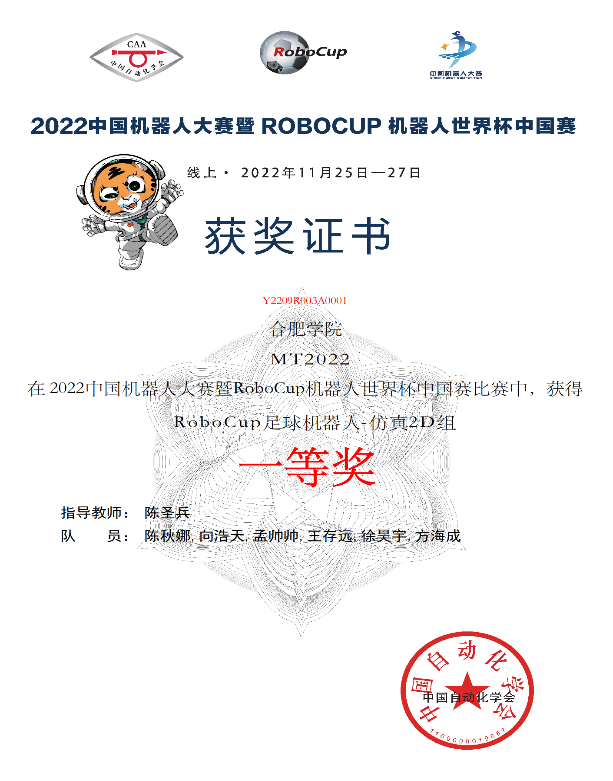 本次大赛吸引了国内220所高校的843支队伍、共4500多人参加,比赛项目分为足球类人组、仿真组、救援组等17个项目。我校人工智能与大数据学院的陈秋娜、向浩天、孟帅帅、方海成、王存远、徐昊宇组成的MT2022球队在陈圣兵教授的带领下,与来自南京大学、中南大学、东北大学、合肥工业大学和安徽工业大学等多所国内知名机器人球队同台竞技,队员们针对对手攻防特点不断改进策略、优化动作,最终获得仿真2D项目组冠军。