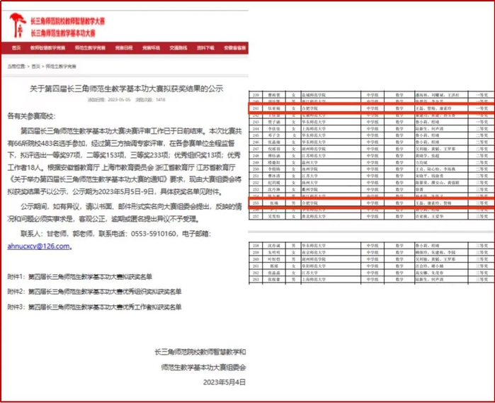 5月6日,由安徽省教育厅、上海市教育委员会、浙江省教育厅、江苏省教育厅主办的第四届长三角师范生教学基本功大赛决赛拟获奖名单公示。我校20级数学与应用数学专业伍亚楠和张瑞同学在与来自华东师范大学、浙江师范大学的优秀学子的同场竞技中发挥出色,分获一等奖和三等奖。据悉,在此前进行的安徽省师范生教学技能竞赛中,伍亚楠和张瑞双双获得一等奖并入选中学数学组“省队”,代表安徽省参加了此次长三角师范生教学基本功大赛。此外,在4月16日进行的“田家炳杯”第八届全国师范院校师范生教学技能竞赛决赛中,20级数学与应用数学专业吴倩同学获得二等奖,这是数学与应用数学(师范)专业连续三年进入决赛并获得二等奖。