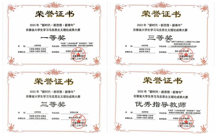 日前,由安徽省教育厅主办的2023年“新时代•新思想•新青年”安徽省大学生学习马克思主义理论成果大赛圆满落下帷幕,评审结果已在安徽省教育厅网站公布。本次比赛是我省马克思主义理论学科唯一的大学生学科与技能竞赛,我校马克思主义学院连续四年组织学生参赛,本次选送的作品荣获一等奖1项、三等奖2项。