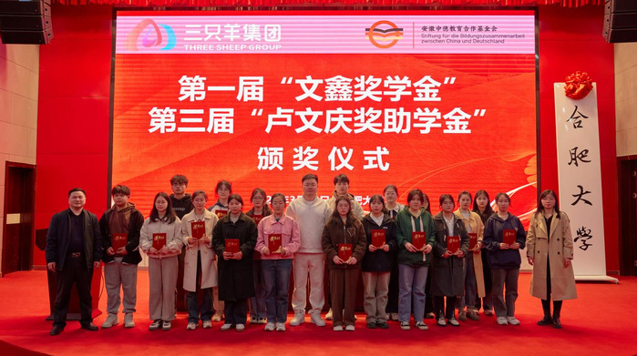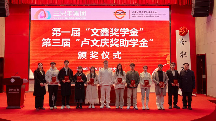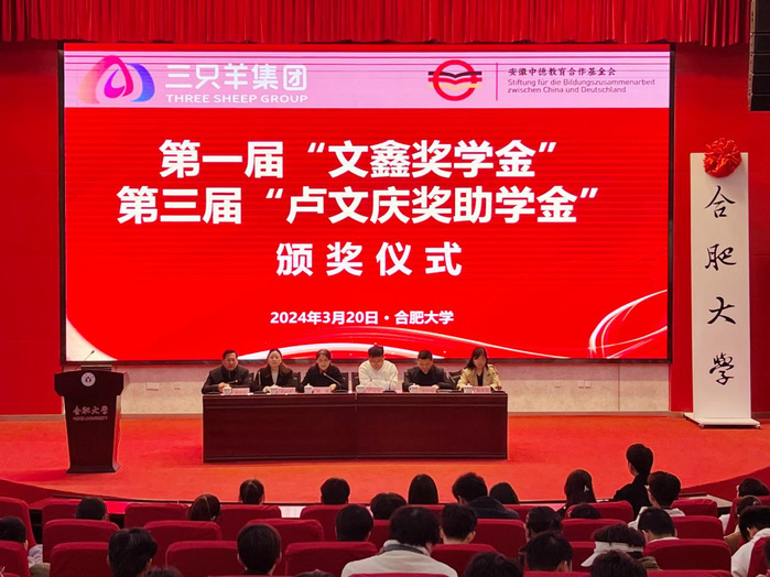 3月20日下午,第一届“文鑫奖学金”和第三届“卢文庆奖助学金”颁奖仪式在我校图书馆报告厅A厅举行。三只羊集团创始人兼董事卢文庆,我校副校长、安徽中德教育合作基金会理事长陈秀出席仪式,基金会办公室主任刘金平,人工智能与大数据学院院长余海峰,人工智能与大数据学院党委副书记、纪委书记姚蓓蓓,相关负责老师及获奖助学生等参加仪式。仪式由基金会秘书长何世昆主持。